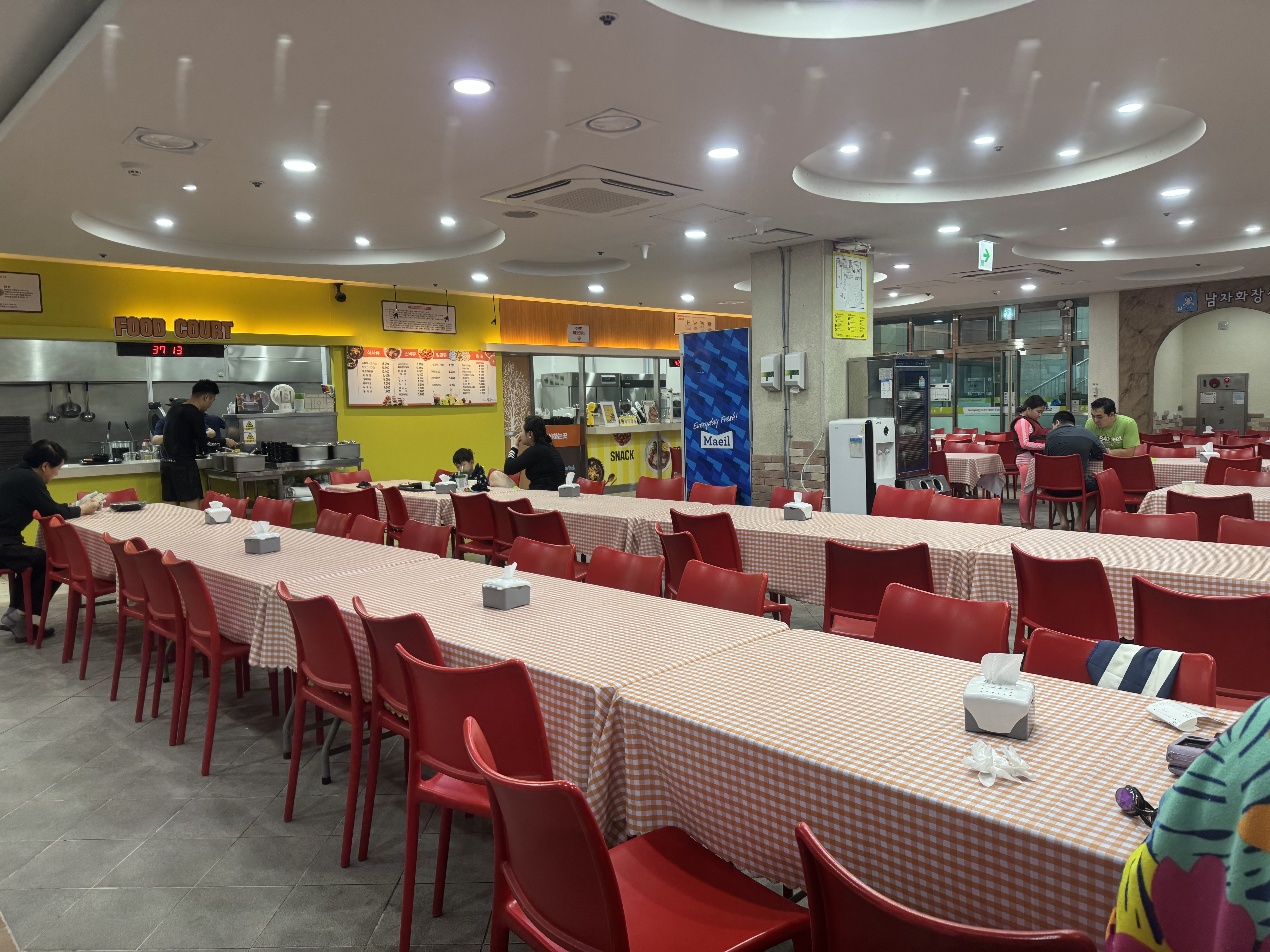 워터파크 내에는 간단한 식사를 해결할 수 있는 식당이 마련되어 있습니다. 메뉴는 컵밥, 우동, 어묵, 라면, 음료 등 간단한 구성으로, 자극적이지 않은 음식 위주로 제공되어 유아와 함께 먹기에 비교적 무난했습니다. 다만 이유식 단계의 아이라면 별도 이유식 도시락이나 간식을 준비해 가는 것이 좋습니다.
